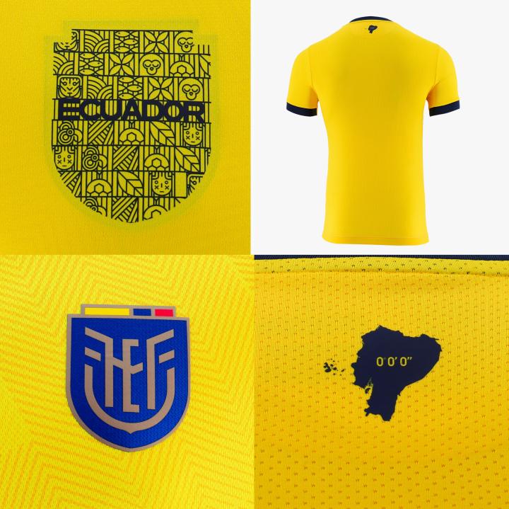 相比起颜色,最令人称道的还是球衣上多处独具匠心的细节设计:三件球衣在背后的脖颈处都印有厄瓜多尔的地图剪影,其中的0°0'0"代表穿过国境的赤道纬度,在以赤道之国自居的厄瓜多尔,这个数字也有“世界的中心”之意。