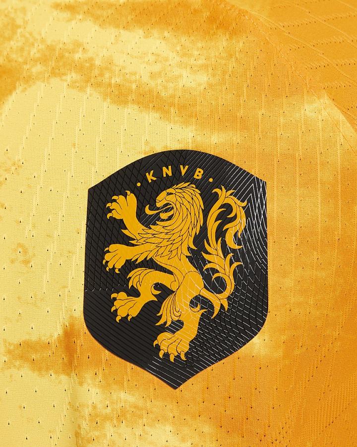 荷兰队今年的主场球衣一度是最令我捉摸不透的一个:仅从图片上看,这件橙色战袍有一种仿佛野兽毛皮般的质感,且明暗的交错让它在任何角度都显得熠熠生辉。仔细观察才发现,这种反光与褶皱其实是由几种不同深浅度的橙与黄交织扎染而成的模拟效果,Nike将这种亮丽的颜色称作“激光橙”,而球衣纹路上的灵感据悉是取自“雄狮的鬃毛”,不仅形象与颜色都很贴切,也正好对应了荷兰队徽上的狮子形象。