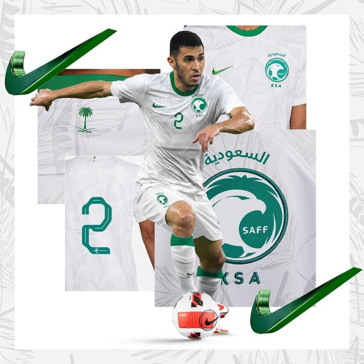 主场球衣是纯白色,遍布其全身的就是一片片棕榈叶的暗纹。不过需要指出的是,同上面一模一样的花纹设计其实早在沙特2020年的客场球衣上就有出现,此次的“复制粘贴”,也许是Nike又一次偷了懒吧……