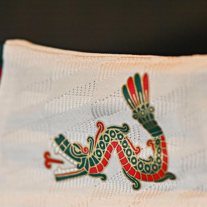 如果你和我一样是位FGO玩家,想必对这个名字不会陌生。在当地的神话传说中,羽蛇神是司掌风雨、丰收与生命的神,祂主宰着晨星,发明了书籍与历法,民间的形象则通常是一条长满羽毛的蛇,因此在这件主场球衣的脖颈周围,大片形同羽毛或是鳞片状的花纹也正是来源于此。绿色、白色外加红色条纹的点缀让球衣整体配色十分鲜亮,在领子内侧还有一个代表羽蛇神的图腾纹样,对比古老的石像遗迹,可以说是非常还原了。