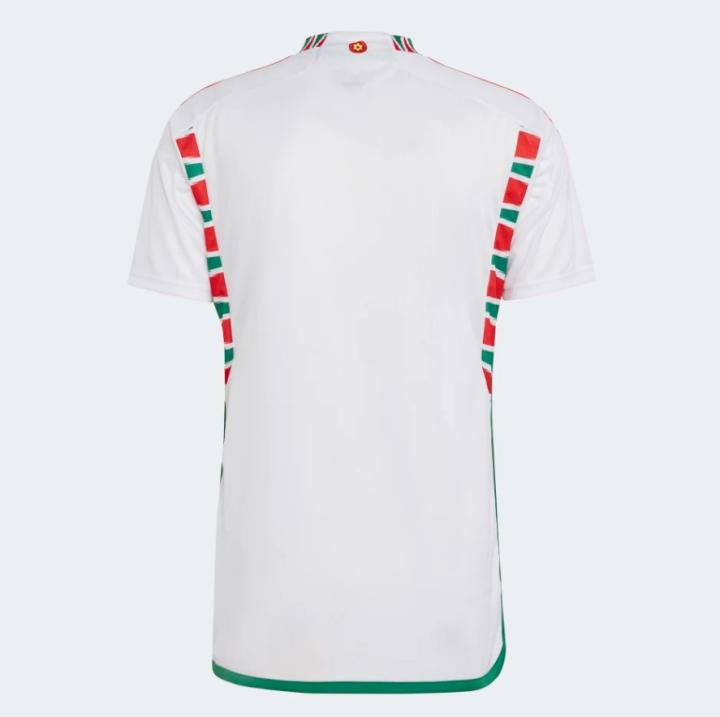 客场球衣全身宛如牛奶一样白,最醒目的地方无疑是那红绿相间的花边领子,同样的条纹还能在球衣的背后两侧看到,与白色搭配构成了威尔士的旗帜颜色,尽管面积不大,但一下子就提高了球衣的辨识度。颈部背后印有威尔士国花——水仙花的logo图案,也是一处颇为小清新的设计。