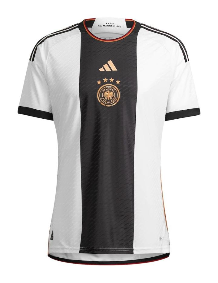 今年,Adidas在他们的主队德国身上整了个大活儿:主场传统的白色球衣上,一条粗壮的黑色条纹由上至下穿过,金色的队徽位于胸前正中央,在黑色的映衬下显得更加醒目,只要不联想到奥特曼之类的东西,可以说就是一件既有设计感又美观,黑与白浓墨重彩的搭配非常具有德国的风格,有潜力成为一代的经典。