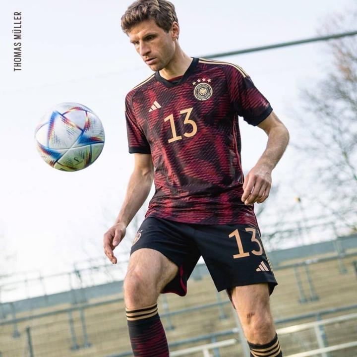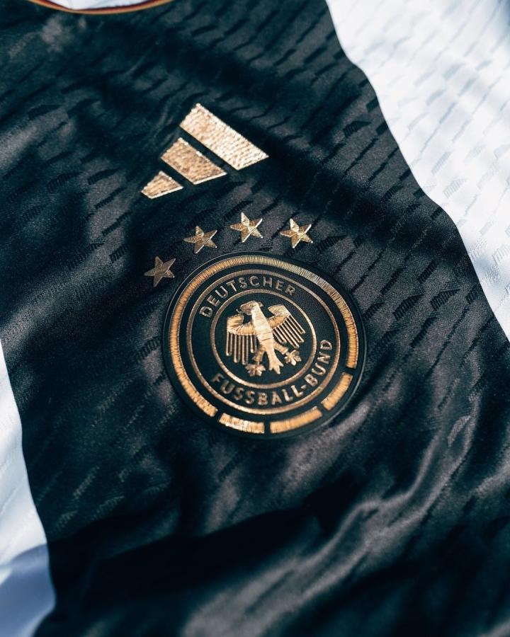 相比之下,德国队这次的客场球衣倒是获得了满堂喝彩。黑+红+金色的搭配不仅好看惹眼,球衣上遍布的三角形暗纹也是既漂亮又有现代感,这其实是取自德语“Deutschland”中的字母D,也是德国足协的logo图案。