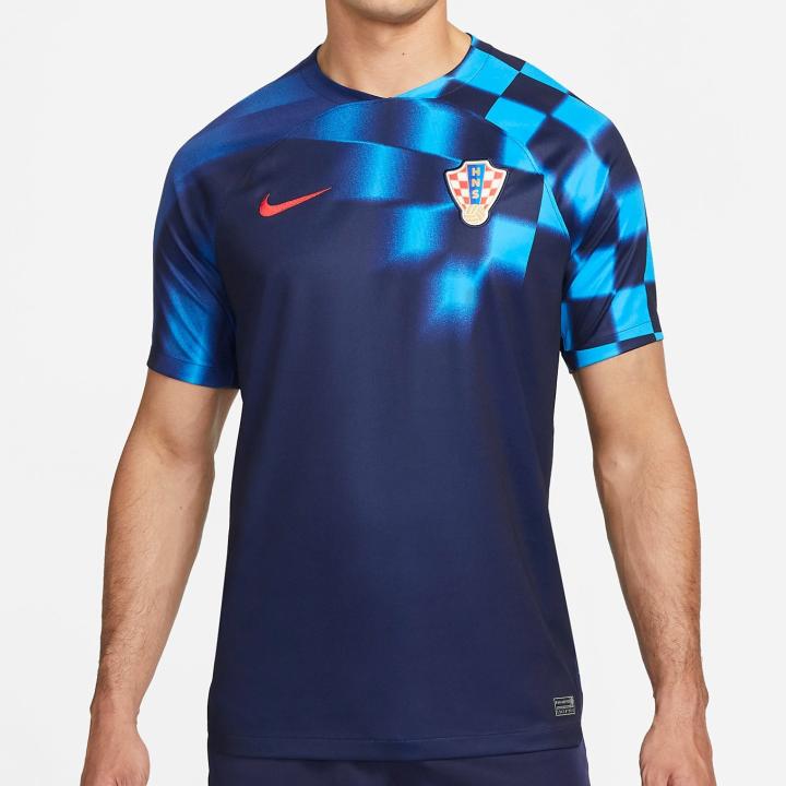 克罗地亚的客场球衣沿用深蓝色,偏居在左肩的格子大约只占球衣的1/6,还加入了模糊与炫彩的特效,右臂处也有与之配套的花纹,让整件球衣看起来颇具现代与动感,球衣号码则从居中位置移动到了右侧靠近胸部。