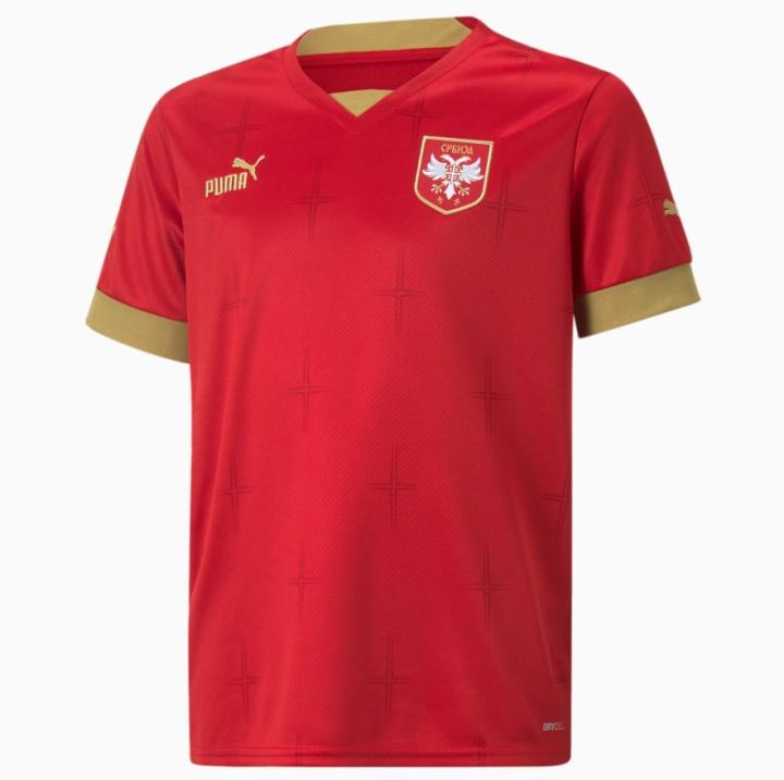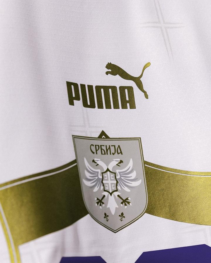 细节方面,主场球衣正面交错分布着一个个小型十字图案,其来源同样是塞尔维亚国徽上的白色十字。说到这里,今年塞尔维亚队也更换了一版全新的队徽,相比于前面两家的队徽简化,塞尔维亚却是反其道而行,将国徽上那只霸气的双头鹰在多年后又移回到了球衣之上,形象则是更加现代化,并将在世界杯上迎来它的首秀。