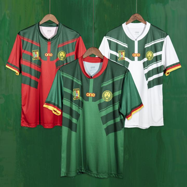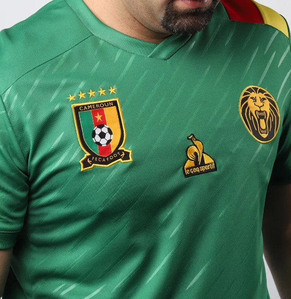 球衣袖口处使用了喀麦隆国旗上的三色条纹,正面则保留了喀麦隆足协与“非洲雄狮”logo分居两侧的设计,只不过居中的赞助商标志已然换成了“One”的字样。