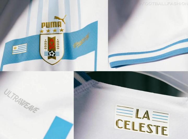 不过相比之下,客场的这件蓝白就不大得行了……纯白底色与蓝色包边的设计像极了我们人手一件的短袖校服,模板化的方框与印号也没有特别的新意,球衣后颈处则印有乌拉圭的绰号——蓝白军团(La Celeste)。