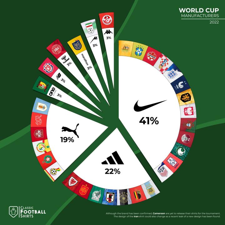 世界杯开幕前夕,喀麦隆国家队的球衣闹出了不小的争议:足坛名宿埃托奥领导的足协于今年7月突然单方面宣布与法国品牌“大公鸡”Le Coq Sportif结束合作关系,而接下来他们官宣的新赞助商出乎了所有人的意料——One All Sports,一个绝大多数人闻所未闻、且此前从未进军过足球领域的赛车服品牌。至于其中的原因,据悉是这家品牌提出了一个让喀麦隆足协“无法拒绝”的历史最高额赞助报价。