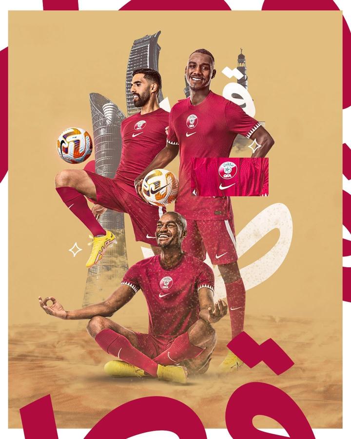 身为东道主,卡塔尔本届世界杯的主客场球衣并没有太多整活式的设计,深红+白色点缀的主场球衣一眼就能看出是卡塔尔的国旗配色,球衣袖口处的锯齿纹路进一步展现出了国旗元素,队徽居中也是Nike如今主打的球衣设计。