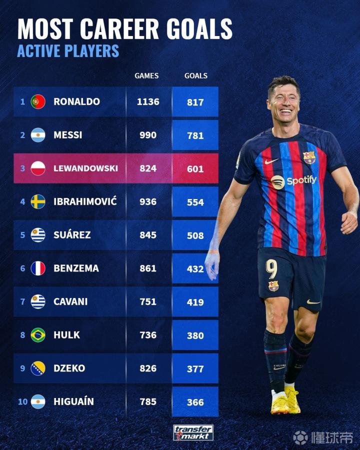 德国转会市场网站列出了现役球员职业生涯进球榜,C罗817球居首,梅西781球列第二,日前达成600球里程碑的莱万以601球排名第三。