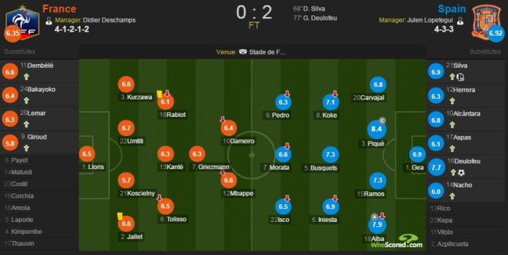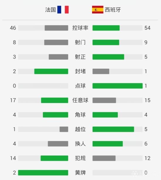 第88分钟,勒马尔前场送出传中,格列兹曼门前的头球冲顶人进球没进。第90分钟,西班牙前场打出连续配合,德乌洛费乌禁区前横传,席尔瓦跟上的推射打偏了。最终,西班牙2-0胜法国。