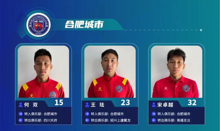 2022中国足球协会会员协会冠军联赛(中冠联赛)今日正式公布了二次转会注册报名名单,合肥城市在二次转会期引入了何双、王珐和宋卓越三名新援。
