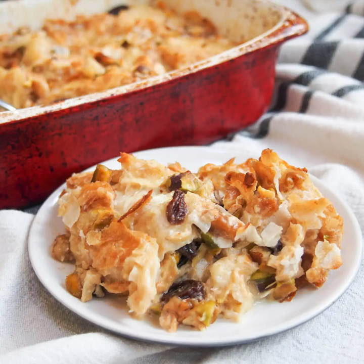 Umm Ali则是一道风靡整个阿拉伯世界的经典甜品,从北非的埃及到卡塔尔甚至是黎凡特地区,都可以在当地人的餐桌上见到这道面包布丁的身影。与其说这是面包布丁,更准确的描述应该是千层面、布丁、泡芙皮和本地特色坚果(通常是核桃或开心果)以及葡萄干的超级杂烩。它的形状也不固定——盛它的盘子有多大,它就可以有多大。