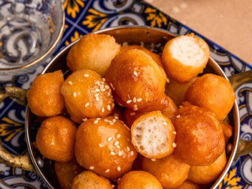 吃完主菜,餐后甜点的部分更加精彩。阿拉伯人是嗜甜的民族,除了人工提炼的糖浆,蜂蜜、椰枣、玫瑰也都是阿拉伯甜点当中甜蜜的来源。卡塔尔人的餐桌也没有例外地继承了这一点。比如说这道名叫Lokma的炸甜面丸子,淋上玫瑰水和糖浆,既可以作为一道餐后甜点,也可以搭配咖啡或茶,把带英军队带来的下午茶传统,进行一些卡塔尔本土化的改造。