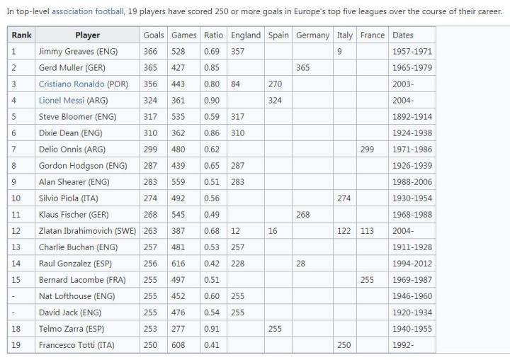 言归正传,我们还是回到五大联赛历史射手榜的话题。根据我这些年的研究,国外目前没有一个网站有统计五大联赛集合的进球数据的,只是在everybodywiki上有人建了个All time top goalscorers in Europe's top five leagues的页面,但是已经很多年没有更新了,并且老英甲球员数据也不准确。