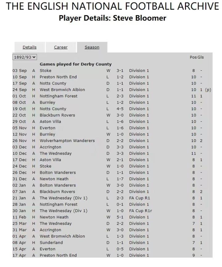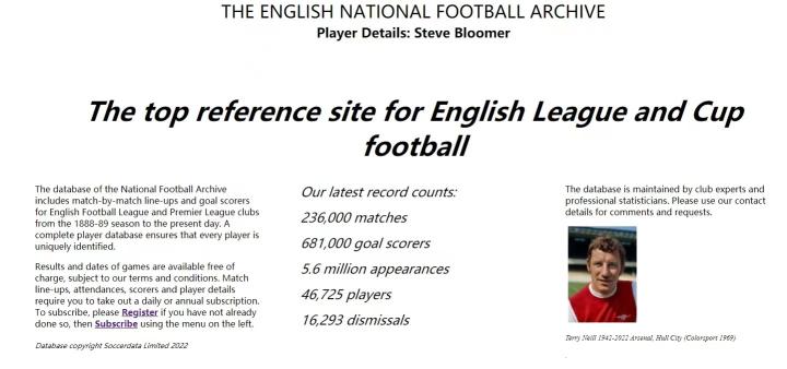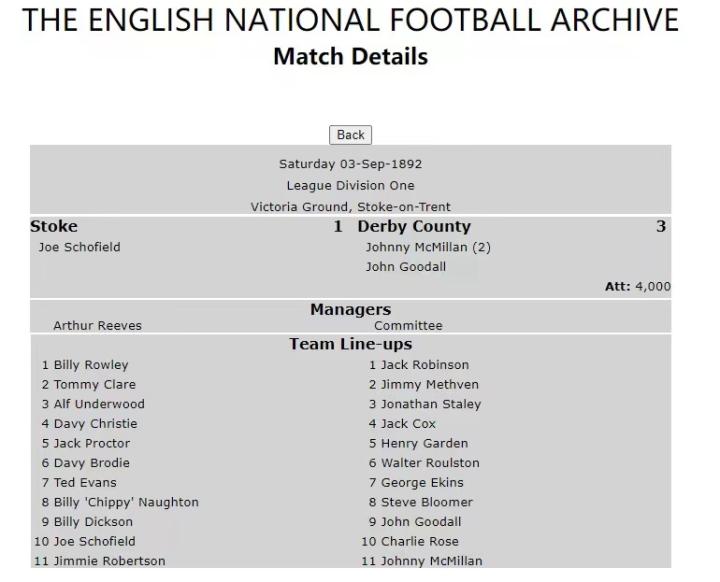 好在之后,我找到了最权威和全面的英国国家足球档案网的这一付费数据网站,这上面的球员数据资料来源于英国国家足球博物馆。从1888-89赛季至今,英格兰顶级联赛每一场比赛的比分、进球球员、出场名单、教练、裁判和出场人数都写的清清楚楚。