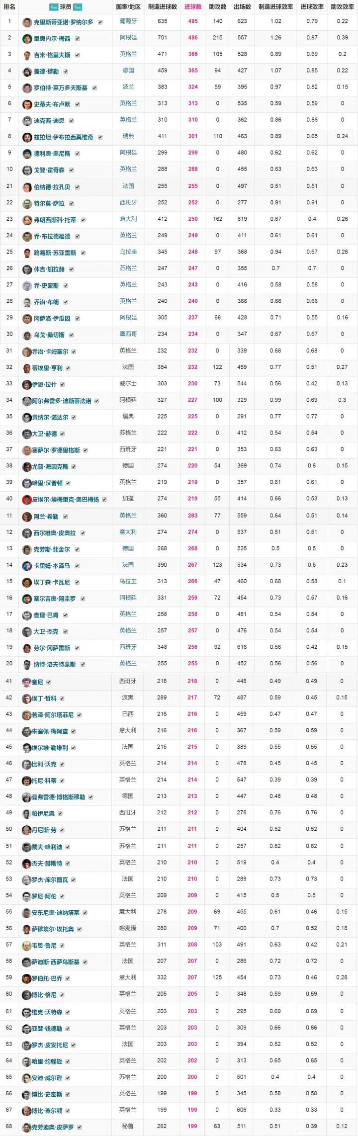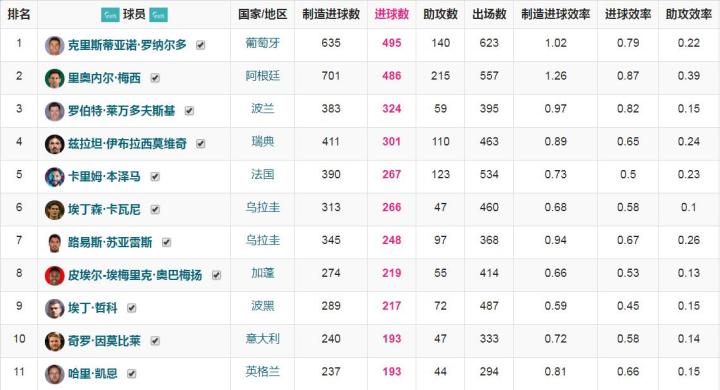 五大联赛历史进球200+全部65人名单:C罗梅西历史前二