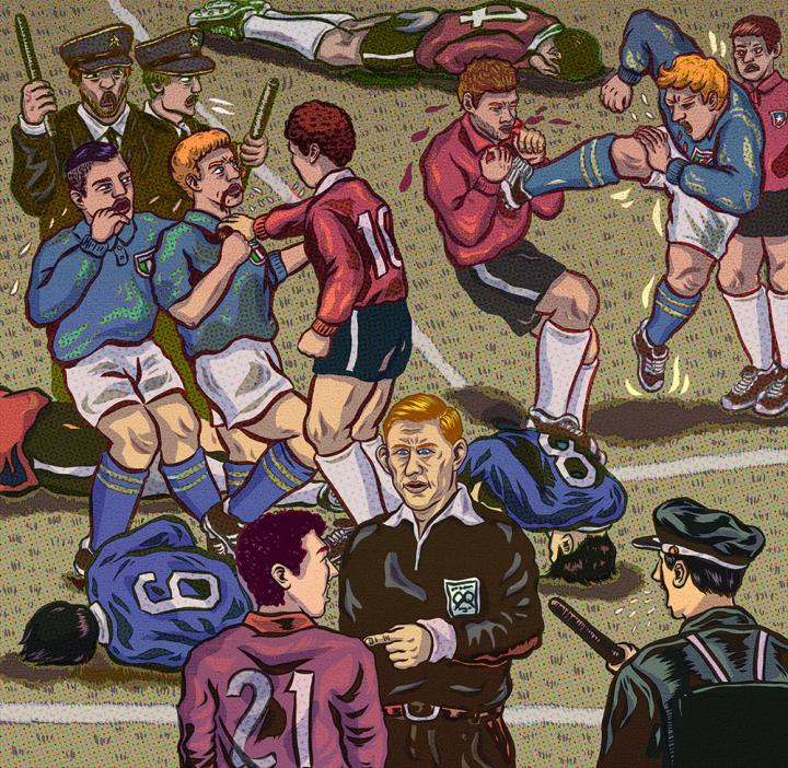 这场著名的格斗比赛,唯一的积极作用是,当场被吓坏的英国主裁阿斯顿,回国多次在噩梦中被惊醒后苦思冥想,发明了红黄牌制度。算是对足球的一大积极贡献。