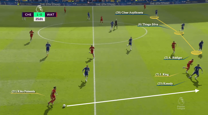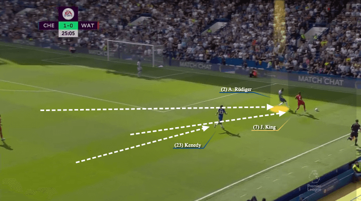 下图是一个例子,吕迪格出任三中卫里的左中卫,沃特福德右边后卫费梅尼亚直传球找约书亚-金,传球越过了蓝军左边翼卫肯尼迪,左中卫吕迪格不得不向左移动处理隐患。
