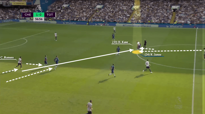 在下面的例子中,扮演右中卫的里斯-詹姆斯前压干扰凯恩。
