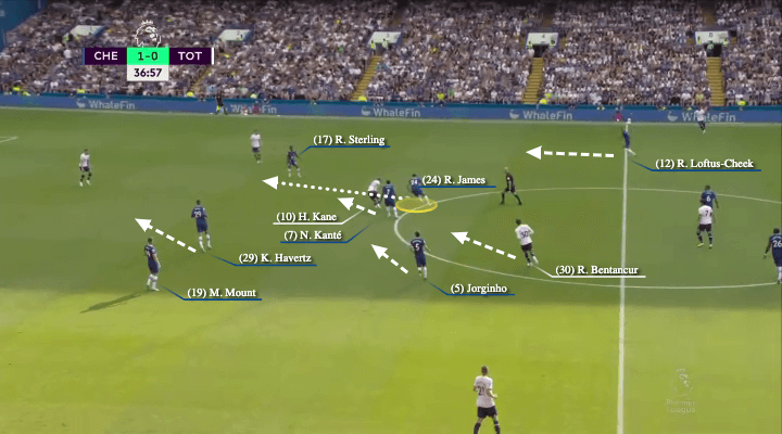 詹姆斯抢回了球权,但他的任务还未结束,他摆脱了凯恩,然后前插进攻,身后蒂亚戈-席尔瓦和库里巴利严密盯防着孙兴慜,严防热刺反击。