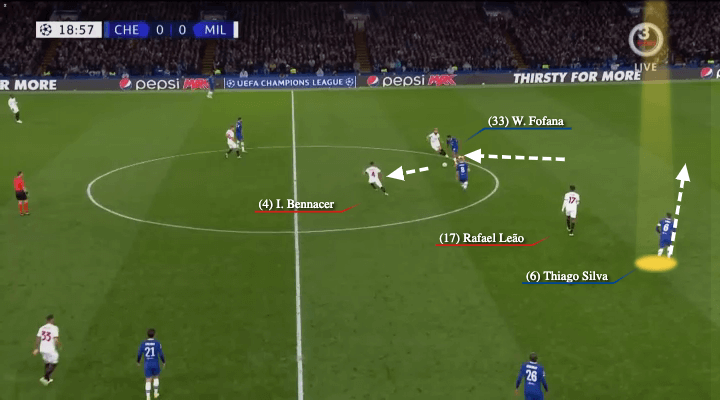 下面是福法纳试图冲破AC米兰的中场防线,被机警的红黑中场本纳赛尔阻止了。蓝军拖后中卫蒂亚戈-席尔瓦觉察到了潜在的危险。