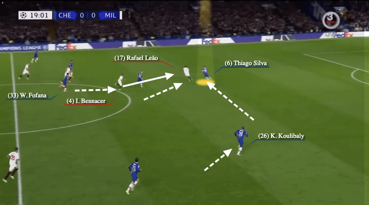 巴西人开始横向移动,本纳赛尔抢回球权后准备找拉斐尔-莱奥,蒂亚戈-席尔瓦适时地出现在莱恩身后,遏止了米兰的攻势。库利巴利也开始横向移动为蒂亚戈-席尔瓦补位。