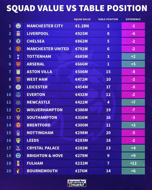 德国知名足球数据网站“转会市场”列出了英超球队的阵容身价排名与目前积分榜的排名对比,总身价排名第一的曼城目前在积分榜位列第二位,而积分榜第一的阿森纳,总身价只排在第六。
