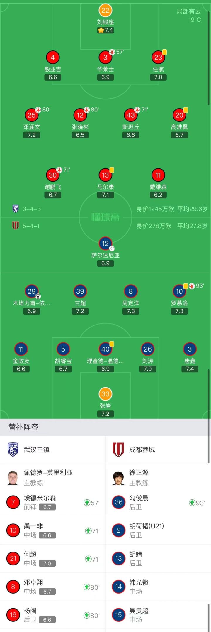 武汉三镇首发:22-刘殿座、3-华莱士(57'7-埃德米尔森)、4-殷亚吉、12-张晓彬(80'8-邓卓翔)、20-高准翼、23-任航、25-邓涵文(80'16-杨阔)、30-谢鹏飞(71'21-何超)、43-斯坦丘(71'10-桑一非)、11-戴维森、13-马尔康