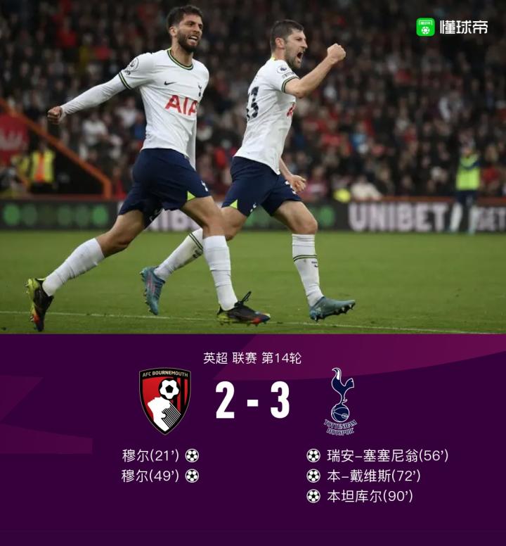 最后时刻,热刺让二追三,补时绝杀!本坦库尔破门热刺3-2伯恩茅斯!