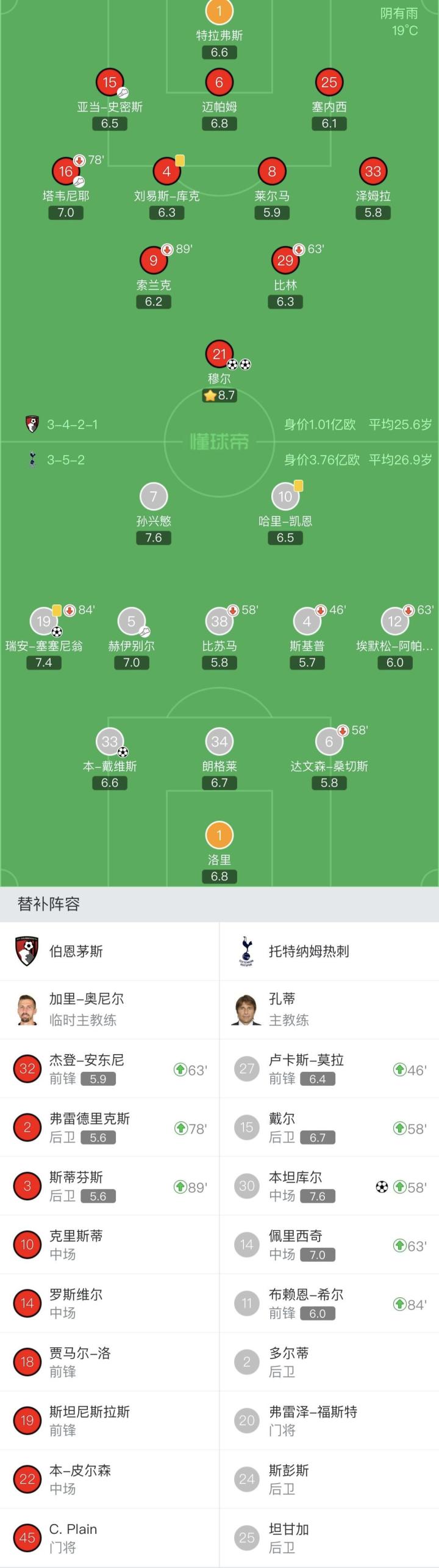 托特纳姆热刺首发:1-洛里、6-达文森-桑切斯(57'15-戴尔)、34-朗格莱、33-本-戴维斯、12-埃默松(63'14-佩里西奇)、4-斯基普(46'27-卢卡斯-莫拉)、38-比苏马(57'30-本坦库尔)、5-赫伊别尔、19-塞塞尼翁(84'11-希尔)、10-凯恩、7-孙兴慜