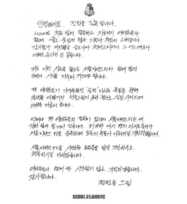 K联赛刚结束,已经有朋友问我转会传闻了。 目前只听到两个,首先是租借在蔚山的日本外援天野纯,目前蔚山现代正在小心翼翼地寻求完全转会的可能。有趣的一点是,蔚山非常“迷信”天野纯的韩文译名(아마노 준,Amano Jun ),拆开来就是아마 (可能)노(NO) 준(亚军),连起来的意思是“可能不再是亚军”。最终,蔚山现代时隔17年终于再次捧起联赛冠军奖杯。迷信的蔚山现代目前希望能够买断天野纯。 另外一个就是K2联赛首尔衣恋的主帅去留,执教三年的郑正溶大概率要离队。郑正溶曾经带领韩国U20拿到U20世界杯的亚军,在首尔衣恋的三个赛季,排名分别是第5,第9和第7。图3是郑正溶写给首尔衣恋球迷的告别信。