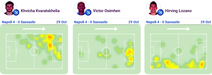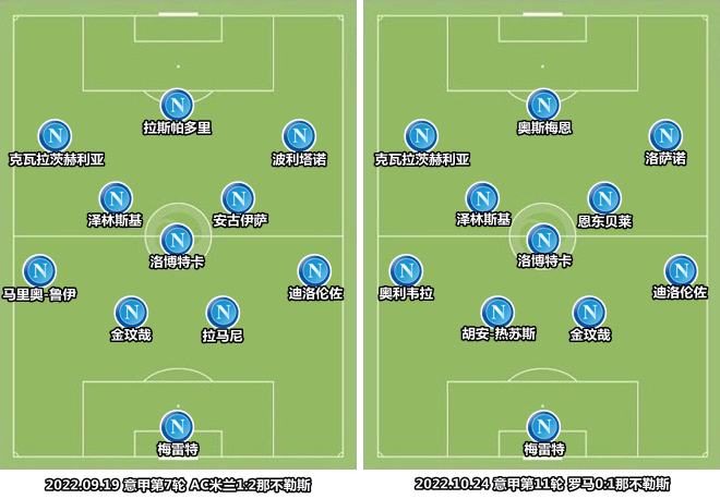 (图)奥斯梅恩和克瓦拉茨赫利亚都具备边中摇摆能力,洛萨诺勤于回防来保证阵型的平衡。洛萨诺多次出现在右后卫位置,这意味着迪洛伦佐曾多次助攻向前,局部不断轮转换位是那不勒斯的特色。