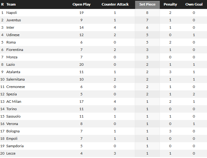 同“Sarri-ball”时代相比,如今的那不勒斯踢得更加现代化,斯帕莱蒂麾下有很多身体素质出众的高大球员,定位球成了蓝衣人的制胜底牌。上赛季,那不勒斯就是意甲通过定位球得分最多的球队(21球),精准的传跑连线令人印象深刻。随着安古伊萨和金玟哉的加盟,那不勒斯的定位球进攻效率持续提升,过去12场联赛已经8次通过定位球得分,领先于其他意甲球队。