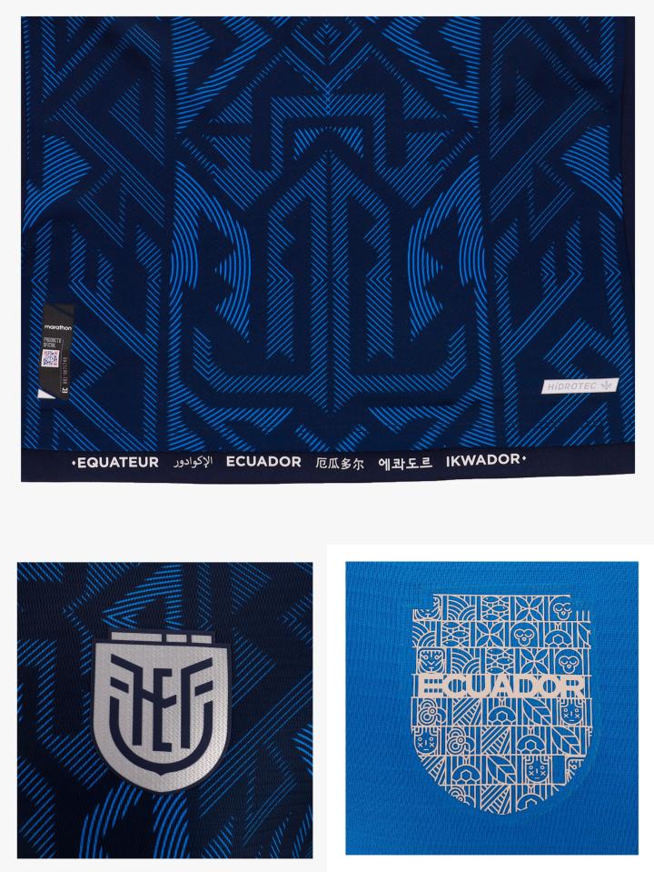 由本土运动品牌Marathon(马拉松)悉心打造的厄瓜多尔世界杯球衣,客场使用了藏青配色,正面大面积的民族风格花纹十分醒目,同时细节方面也是匠心满满:球衣队徽背面有着俏皮的卡通图案,下摆处还有包括中文在内的六国语言写成的厄瓜多尔字样。