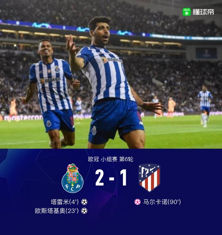 波尔图2-1锁定第1并送马竞垫底出局,奥布拉克高接低挡难救主