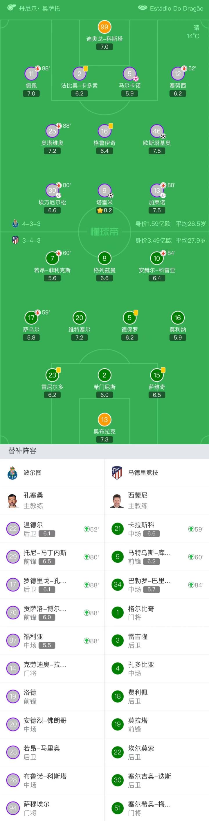 波尔图首发:99-迪奥戈-科斯塔、2-法比奥-卡多索、5-马尔卡诺、9-塔雷米、11-佩佩(88'17-罗德里戈-孔塞桑)、12-塞努西(52'22-温德尔)、13-加莱诺(88'87-福利亚)、16-格鲁伊奇、25-奥塔维奥(88'70-贡萨洛-博尔热斯)、30-埃万尼尔松(80'29-托尼-马丁内斯)、46-欧斯塔基奥