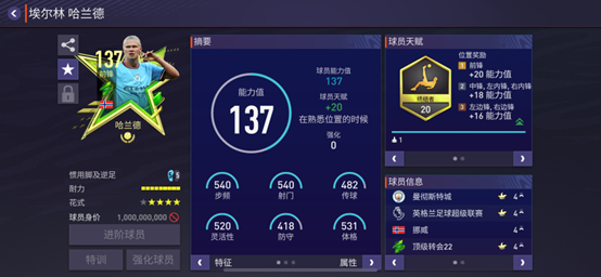 在顶级转会活动中,玩家可以在夏窗超级球星章节中领取5个夏窗重磅球星收集进度礼包后免费获得9阶顶级转会之星哈兰德,成功获得2个顶级转会之星哈兰德后即可交换获得典藏版哈兰德,身高194cm的他在现役前锋中拥有独一无二的身高优势。天赋方面,哈兰德配备了终结者天赋,这项天赋对他终结能力显著提升的同时还增强了哈兰德的加速,使他的持球进攻威胁大大增强。实战中,哈兰德身材高大同时拥有马赛回旋花式,在前锋位置上实力出众。拥有反越位大师特性的哈兰德跑位极其出色,禁区内的大力抽射和鱼跃冲顶是他最擅长的得分方式。除此之外,强壮的哈兰德不惧怕与任何防守球员进行正面对抗,与任何顶级中后卫的直接交锋中不落下风,哈兰德的积极和勇敢使他成为球队中必不可少的一环。