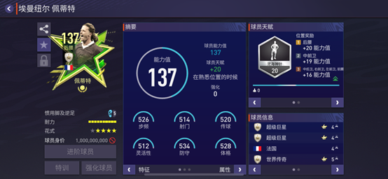 在顶级转会活动中,玩家可以在重磅球星章节中集齐章节内4张顶级转会之星球员后免费获得9阶顶级转会之星佩蒂特,成功获得2个顶级转会之星佩蒂特后即可交换获得典藏版佩蒂特。天赋方面,佩蒂特配备了定海神针天赋,这项天赋对他的防守能力再度加强,同时使佩蒂特的冲刺速度有所提升。实战中,拥有双高攻防效率的佩蒂特是球队中场重要的防守屏障,拥有满格体力、体能充沛的他在场上几乎不会出现失位的情况,人盯人和抢断能力极其出色,能够有效地破坏对手犀利的进攻。而在进攻端,在球队需要佩蒂特参与进攻时,他也能够积极向前场奔进,同时拥有一脚不错的远射功夫,能够为球队做出贡献。