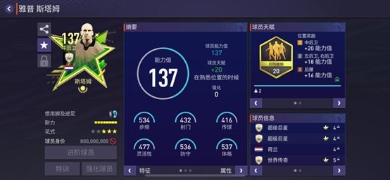 在顶级转会活动中,斯塔姆在TOTS活动后再次产出强力版本。天赋方面,斯塔姆配备了后防统帅天赋,这项天赋对他的防守能力有了显著的提升,同时增强了他的加速和力量。实战中,斯塔姆拥有高防守效率,不会轻易的失去自己在防线上的位置。他更加善于与进攻球员正面对抗和身体接触,依靠全面的防守技术将球断下,交给队友进行反击。角球进攻中,光头的斯塔姆格外显眼,头球能力自然不在话下,是名副其实的空霸。