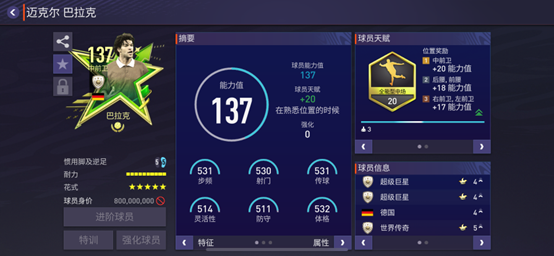 在顶级转会活动中,巴拉克和斯塔姆一样在TOTS活动后再次产出强力版本。天赋方面,巴拉克拥有全能型中场天赋,这项天赋对他防守技术和力量显著提升的同时还增强了巴拉克的远射能力,使他在攻防两端都能够为球队做出贡献。实战中,巴拉克模型宽大同时配备马赛回旋花式,拥有充沛的体能和场上极强的存在感。他在防守端的硬度和积极拼抢是球队中场必备的一大法宝,进攻端的组织调度和后插上远射破门是他帮助球队取胜的一大利器。