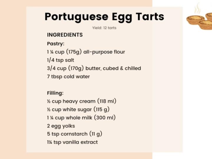 怎么样,看到这里,你一定对美味可口的葡式蛋挞多了一层认知吧?有没有立刻产生准备食材、动手制作的冲动呢?如果你心动了的话,就收下这份制作攻略吧: