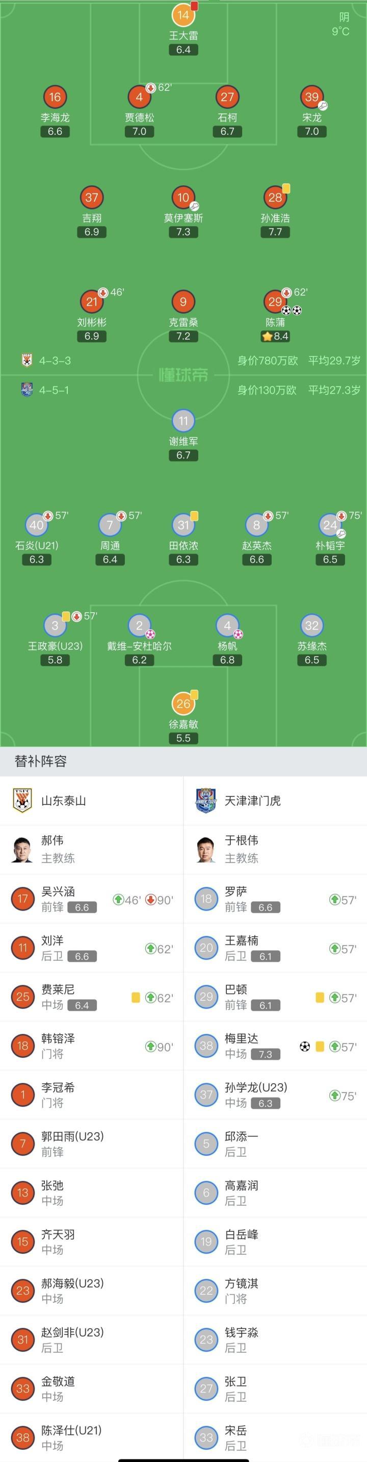 山东泰山首发:14-王大雷、16-李海龙、27-石柯、4-贾德松(62'25-费莱尼)、39-宋龙、37-吉翔、28-孙准浩、21-刘彬彬(46'17-吴兴涵)(91'18-韩镕泽)、29-陈蒲(62'11-刘洋)、9-克雷桑、10-莫伊塞斯