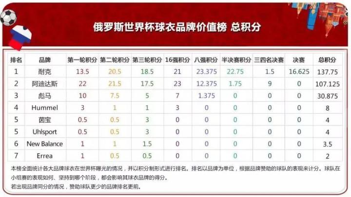 尽管2018年阿迪达斯在数量上占优,但在最后的决赛上,变成了耐克赞助队伍“内战”,决赛对阵的两支队伍法国队与克罗地亚队均是由美国品牌赞助。在2018年俄罗斯世界杯上,耐克在体育大生意制作的《俄罗斯世界杯运动品牌价值榜》上大获全胜,在球衣和球鞋品牌榜单上均“双料制霸”,遥遥领先。