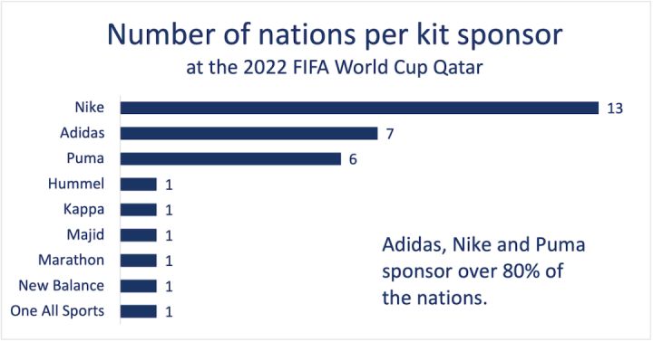 彪马则赞助了6支国家队,与耐克和阿迪达斯形成了三分天下的局面,三家品牌一共赞助了26支国家队。值得一提的是,彪马赞助的最重要的球队——2020欧洲杯冠军意大利缺席了卡塔尔世界杯,也导致了彪马赞助阵容逊色不少。