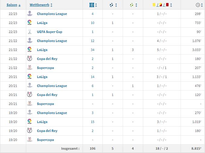 米利唐在本赛季依旧坐稳皇马的首发位置,本赛季为皇马在各项赛事中出场15次,其中13次首发,出场次数比阿拉巴和吕迪格分别少了4次和2次,目前才24岁的米利唐在发挥的稳定性和比赛经验上还有不小的提升空间。