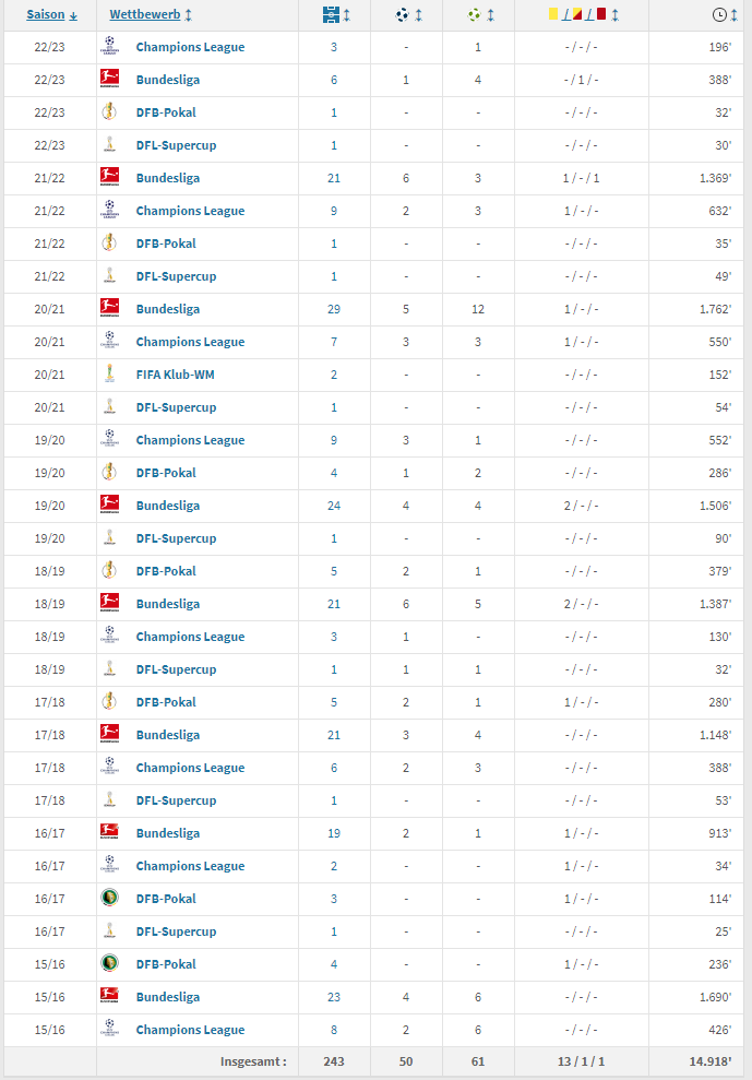 科曼在拜仁的七年多时间为球队出场达到243次,有50个进球和61次助攻,帮助拜仁夺得了包括1次欧冠冠军和7个德甲联赛冠军在内的16座冠军奖杯,也在俱乐部层面完成了荣誉大满贯。