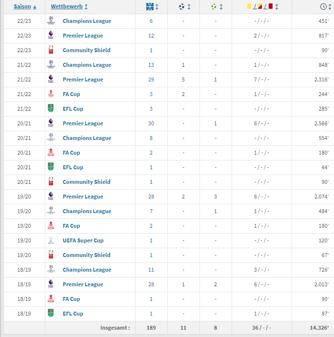 2018年夏窗,利物浦花费了4500万欧元将法比尼奥纳入麾下并在首个赛季就让法比尼奥担任主力中场。来到利物浦的4个赛季中,法比尼奥单赛季的出场次数都高于40次。