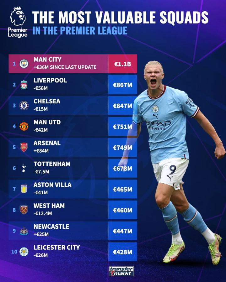 英超球队最新身价排名:曼城11亿欧第一,利物浦第二