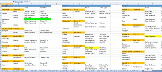 在卷帙浩繁的历史视频资料和各个国家的报纸和杂志的比赛战报资料中,M君足足花了一年多时间,完成了这个阶段的数据统计工作。他的表格之前也公开分享在了中文互联网上,这份表格做的有多么细致呢?他将那十年的每一场比赛,每一个进球,是谁助攻谁,是通过什么方式助攻的,全部都列了出来。